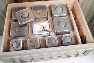 Deep drawers are perfect for housing dry goods like flour and sugar. If you don’t like the idea of bending over to pull out a large drawer, another option is to create open shelving where you can store your dry ingredients in decorative glass containers.