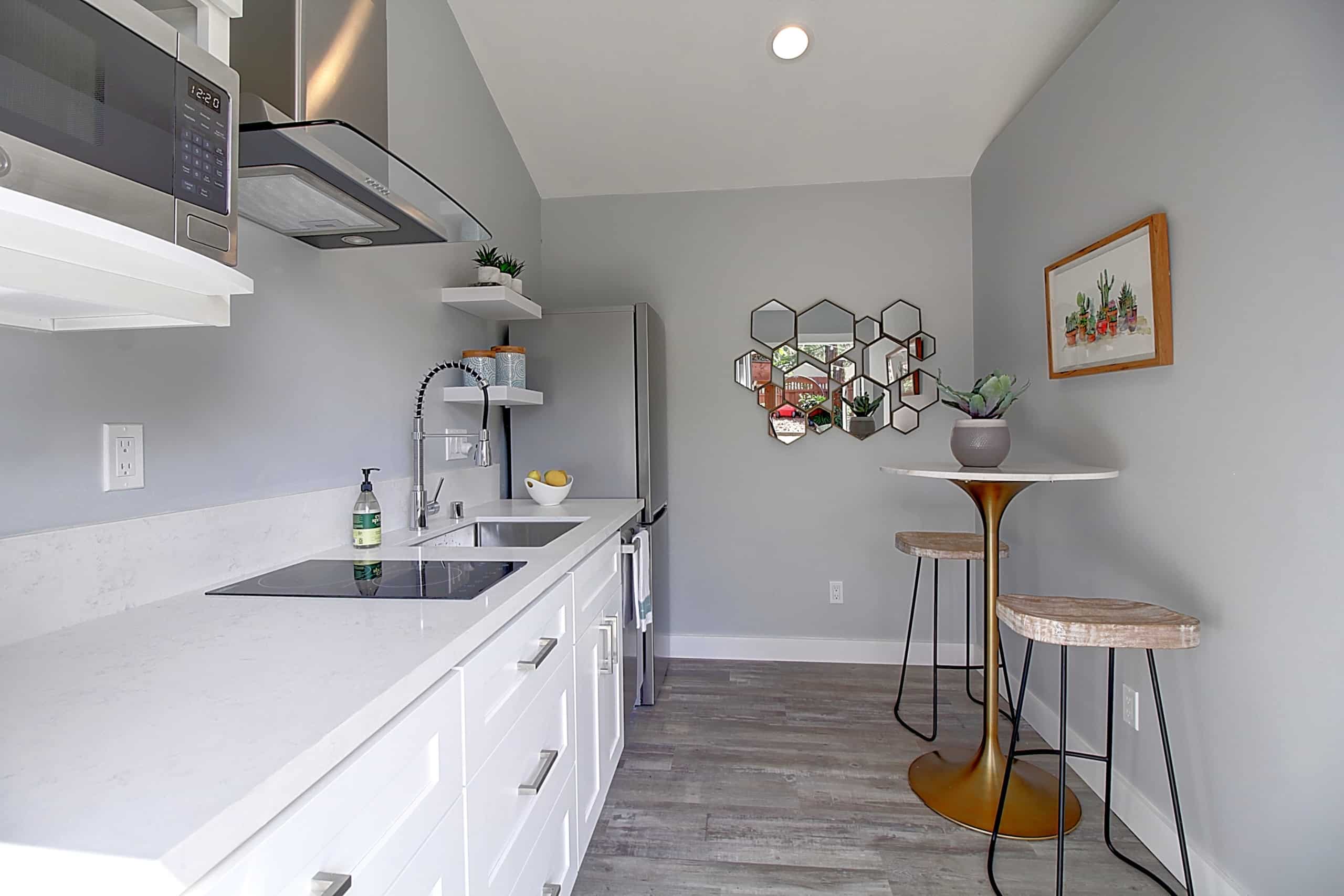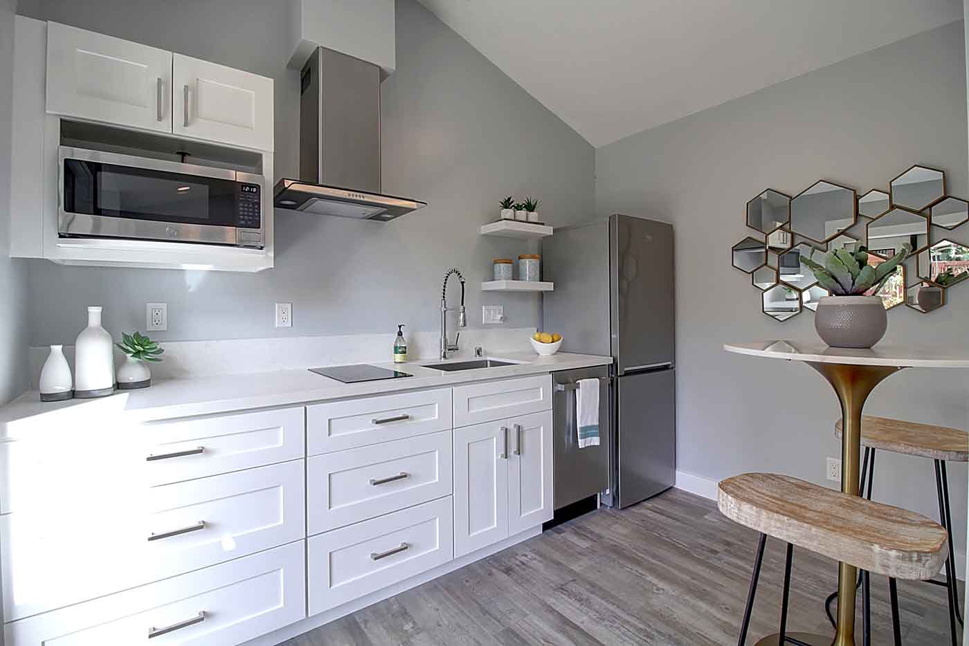 When it came to the visual design and interior selections, our designers wanted to use light finishes that opened up the smaller spaces and gave them an expansive feel. Vaulted ceilings and many windows really help accomplish this, along with adding cross-breezes and airflow. Lastly, reflective materials like stainless steel, nickel, glass, and glossy tiles help light bounce around the space for an airy look.