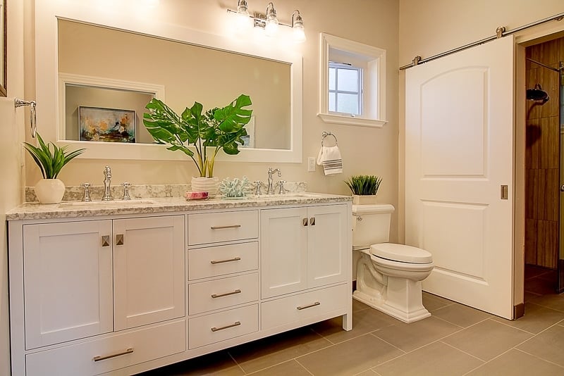 In fact, the bathroom is designed to essentially operate as a wet room, with tile to the ceiling of the shower, on the floor, and as baseboards. The shower is also fully accessible to walk-in, and features a hand-held shower on a slider bar.